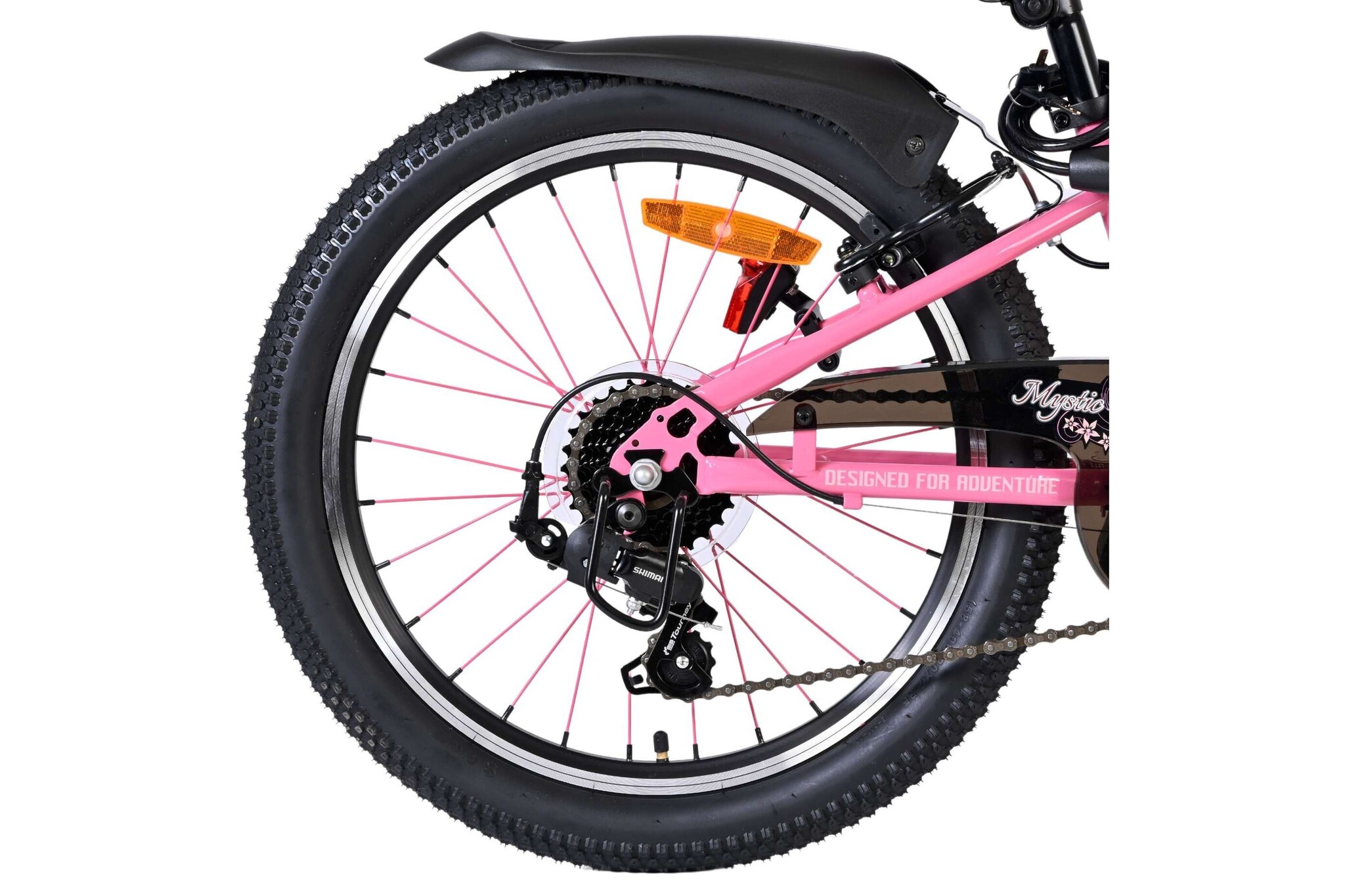 Voor goede zichtbaarheid is de Volare Mystic uitgerust met verlichting aan de voor- en achterkant, aangevuld met reflectoren in de wielen. Het sportieve karakter van de fiets wordt extra benadrukt door de opvallende roze spaken, die zorgen voor een unieke uitstraling. Daarnaast beschikt de fiets over een slot en een bel, zodat je kind veilig en goed voorbereid op pad kan.
